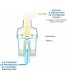- A l’intérieur du nébuliseur, l’air comprimé crée une dépression et déclenche par effet venturi l’aspiration de la solution médicamenteuse et sa projection contre le déflecteur (ou impacteur).