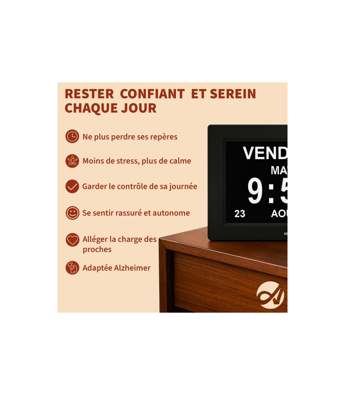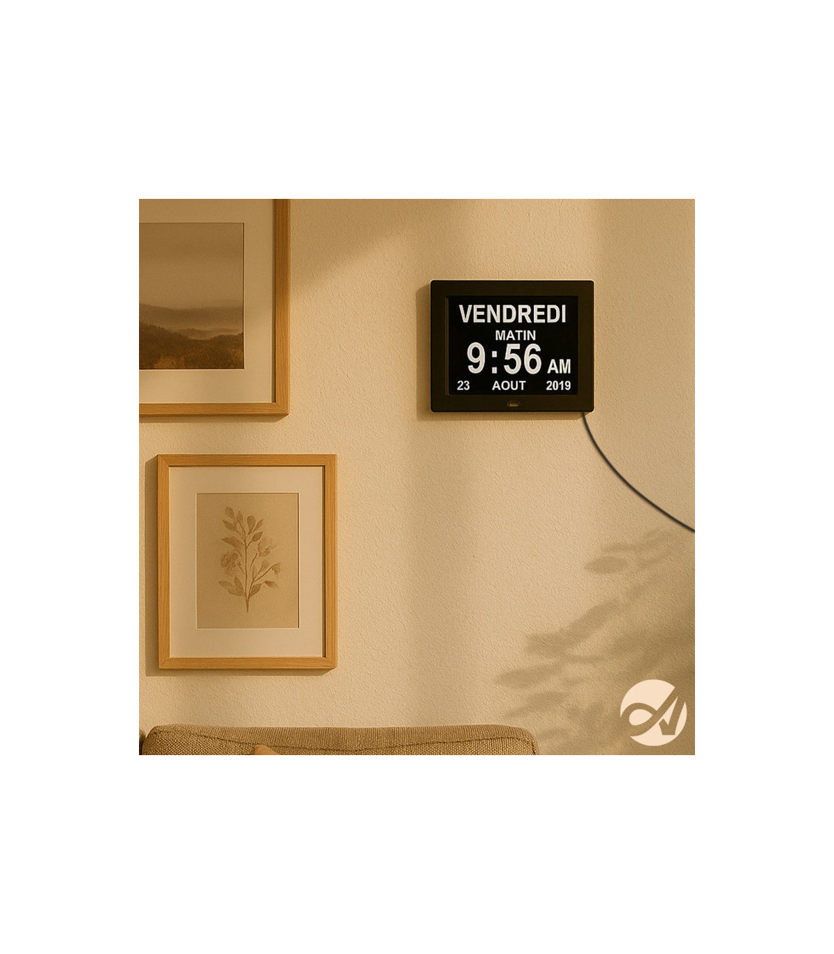 Nous vous proposons une sélection d’horloges aux meilleurs prix adaptées aux personnes atteintes de troubles cognitifs, utiles pour celles vivant avec la maladie d’Alzheimer ou d’autres formes de démence. Ces produits allient simplicité et lisibilité : Affichage heure-date très large, distinction claire des moments de la journée, interface intuitive sans menu complexe. Pensées pour favoriser l’autonomie et la sécurité, elles permettent aussi aux proches et aidants d’apaiser le quotidien. Chaque modèle a été choisi pour sa facilité d’utilisation, son design sobre et sa capacité à créer un repère temporel fiable dans l’environnement de la personne concernée.