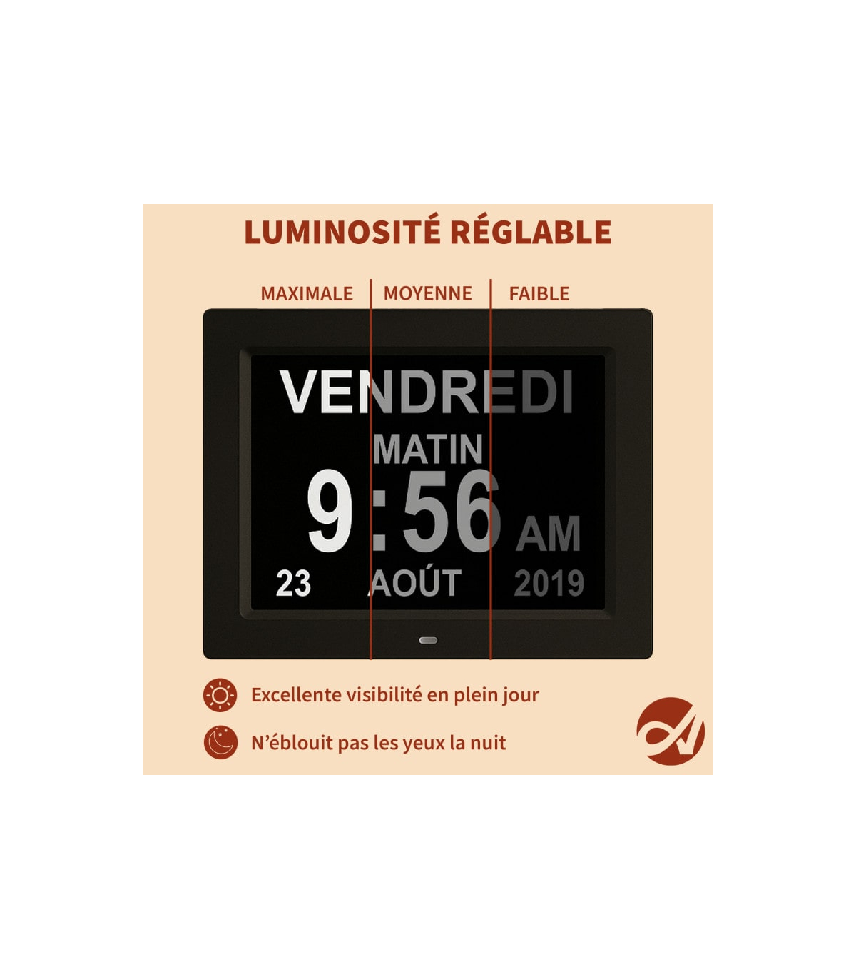 Grâce à son écran haute définition (1024 × 768), l’affichage reste parfaitement net et agréable à lire, même sous différents angles. L’heure, la date et le moment de la journée apparaissent en grands caractères, avec une intensité lumineuse réglable sur trois niveaux pour un confort visuel adapté à chaque environnement.