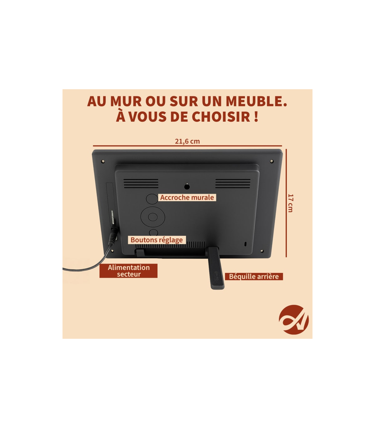 Avec son cadre noir sobre, elle s’adapte à tous les environnements. Alimentée sur secteur, cet accessoire assure un fonctionnement constant et peut être posé sur un meuble ou fixé au mur selon les préférences.