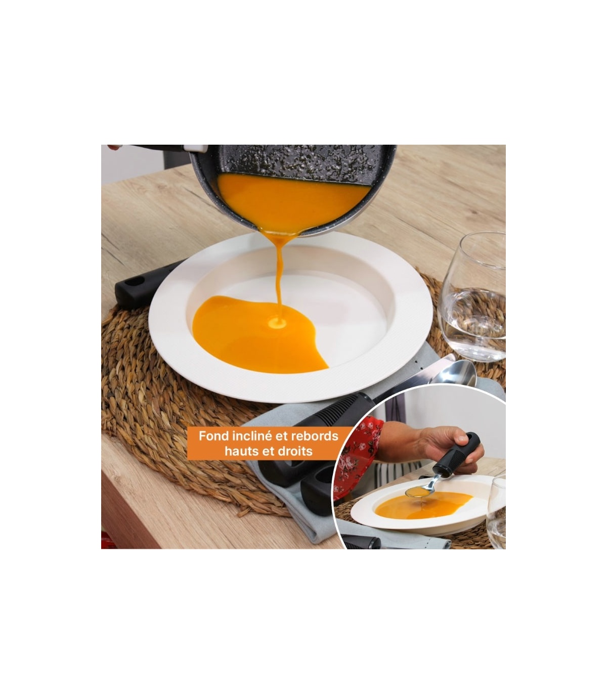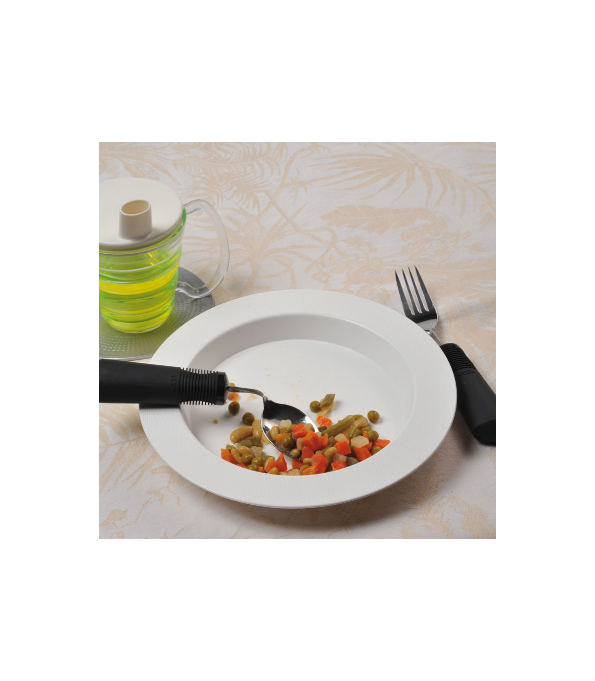 La vaisselle ergonomique dispose de rebords en grainage antidérapants qui aident le patient à tenir son assiette en toute sécurité.