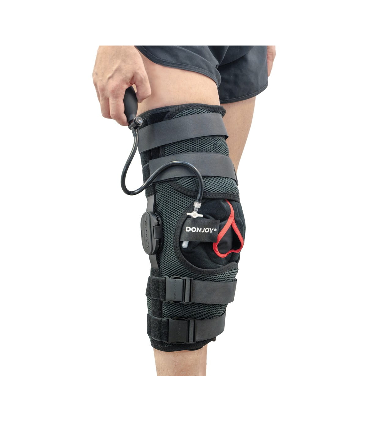 En outre, elle est équipée d’un système de compression avec housse gonflable et pompe manuelle, permettant d’ajuster facilement la pression autour du genou pour améliorer le maintien et réduire l’inflammation.