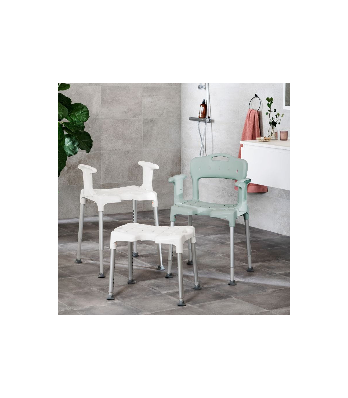Pour satisfaire tous les goûts et s'adapter à chaque intérieur, le siège de douche adulte réglable Etac Swift est disponible en trois coloris sobres et modernes : Bleu, vert et gris.