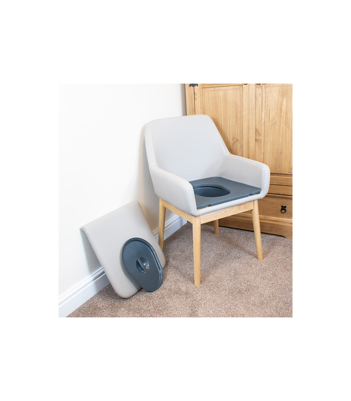 Le fauteuil de toilette percé moderne Elégance appelée aussi "chaise percée" ou "fauteuil garde-robe" est conçu pour faciliter la toilette des personnes à mobilité réduite et des patients rencontrant des problèmes d'incontinences. La découpe circulaire ainsi que le seau amovible offrent à l'utilisateur la possibilité de faire ses besoins sans se déplacer aux toilettes.