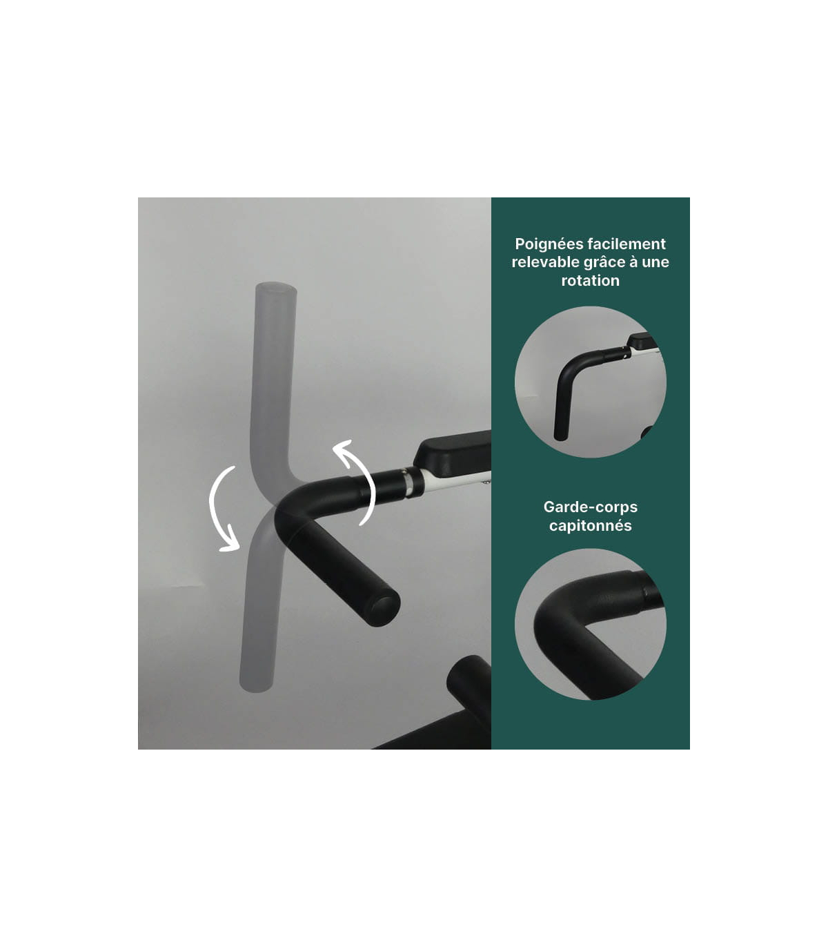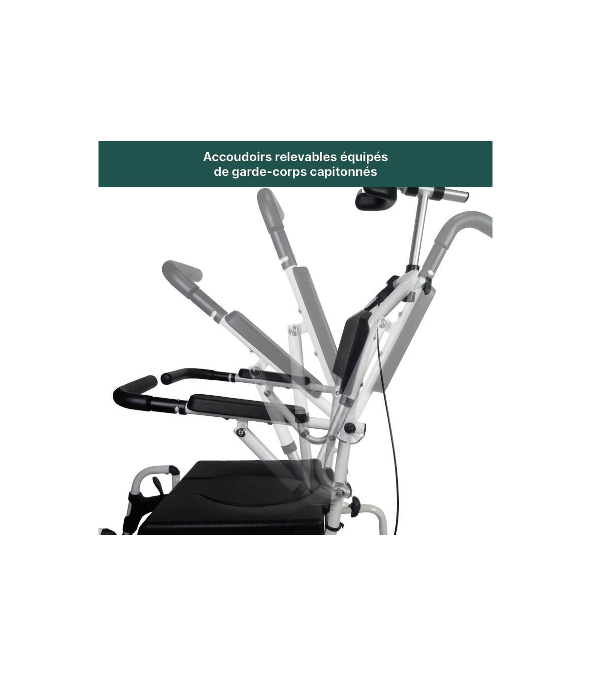 Elle dispose de repose-pieds amovibles réglables ainsi que des accoudoirs relevables avec garde-corps capitonnés pour faciliter les transferts.