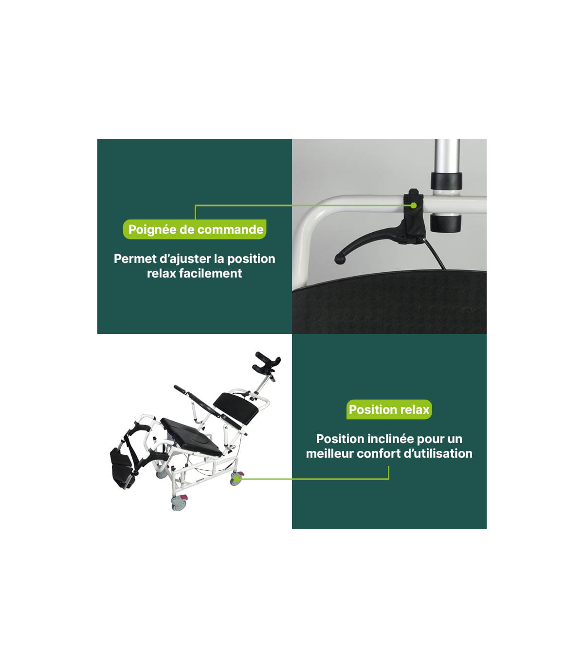 Les points clés du fauteuil de douche percée à roulettes inclinable Formentera