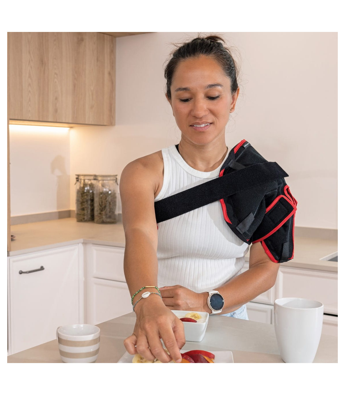 Shoulder Ice peut être portée par-dessus une attelle d’épaule en abduction, comme l'écharpe d'immobilisation épaule Ultrasling, afin de compléter l’immobilisation tout en apportant les bienfaits du froid thérapeutique.