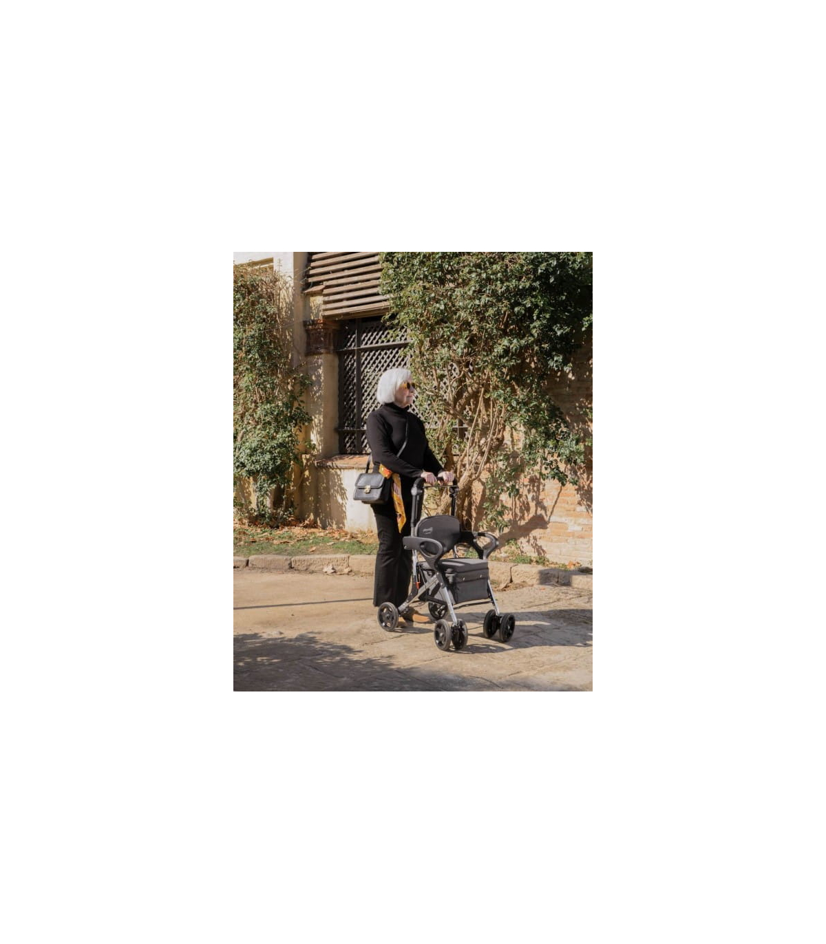 - Sécurité et stabilité : les 4 roues offrent une meilleure stabilité qu’un simple déambulateur, ce qui est utile sur différents types de surfaces (trottoirs, magasins, etc.).