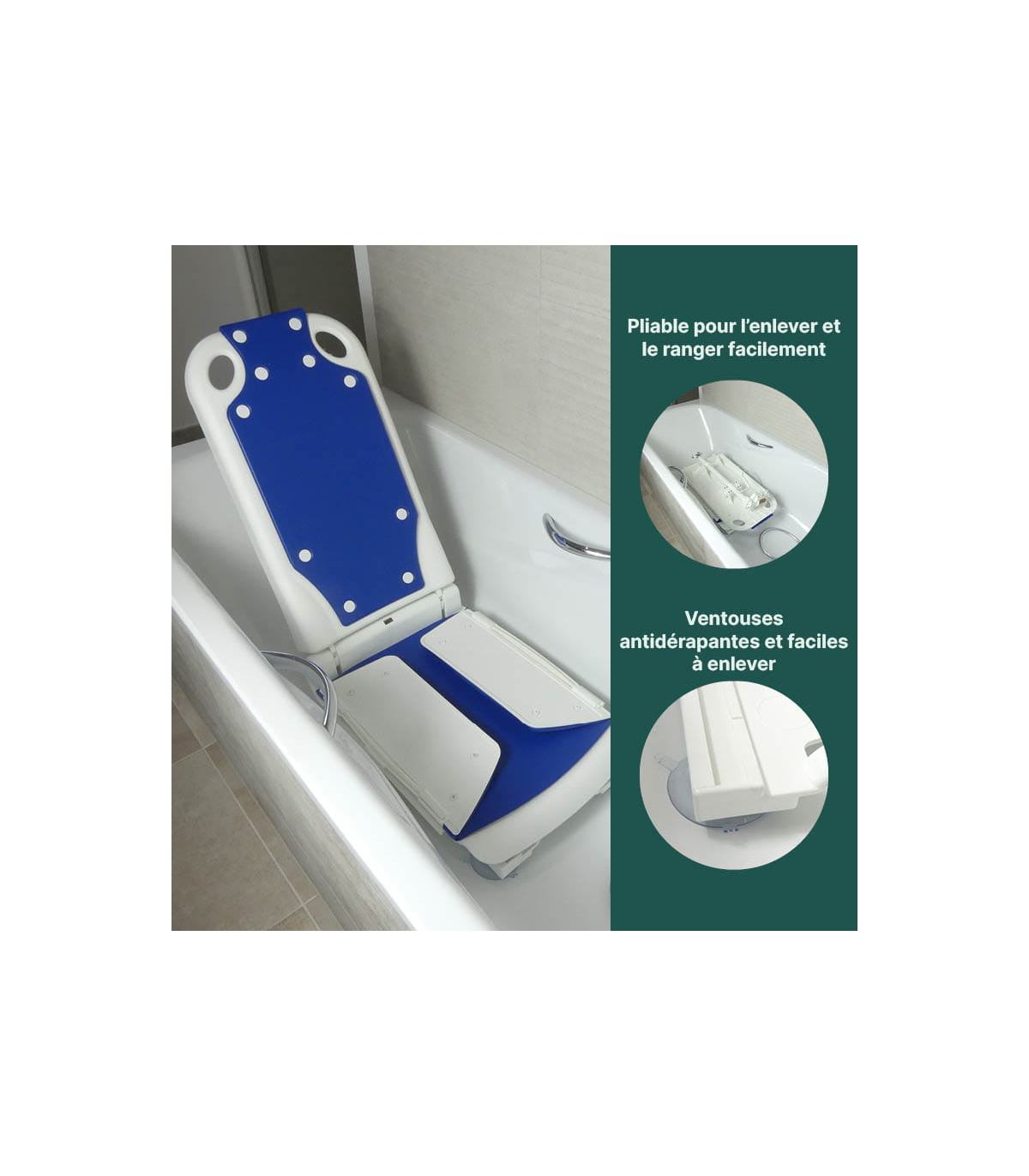 Celui-ci est très compact (larg. assise 40 cm / larg. dossier 36 cm / larg. base: 31 cm) pour le ranger et le transporter facilement. De plus, ce produit de confort se plie pour être extrait sans difficulté de la baignoire, notamment grâce à son dossier qui se rabaisse et se verrouille automatiquement sur l'assise.
