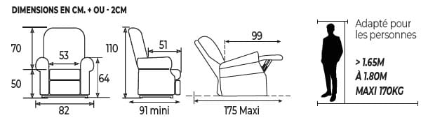 Avant toute commande, il est important de bien prendre les mesures (largeur d'assise / profondeur d'assise / hauteur d'assise) afin de définir la taille de votre fauteuil releveur.