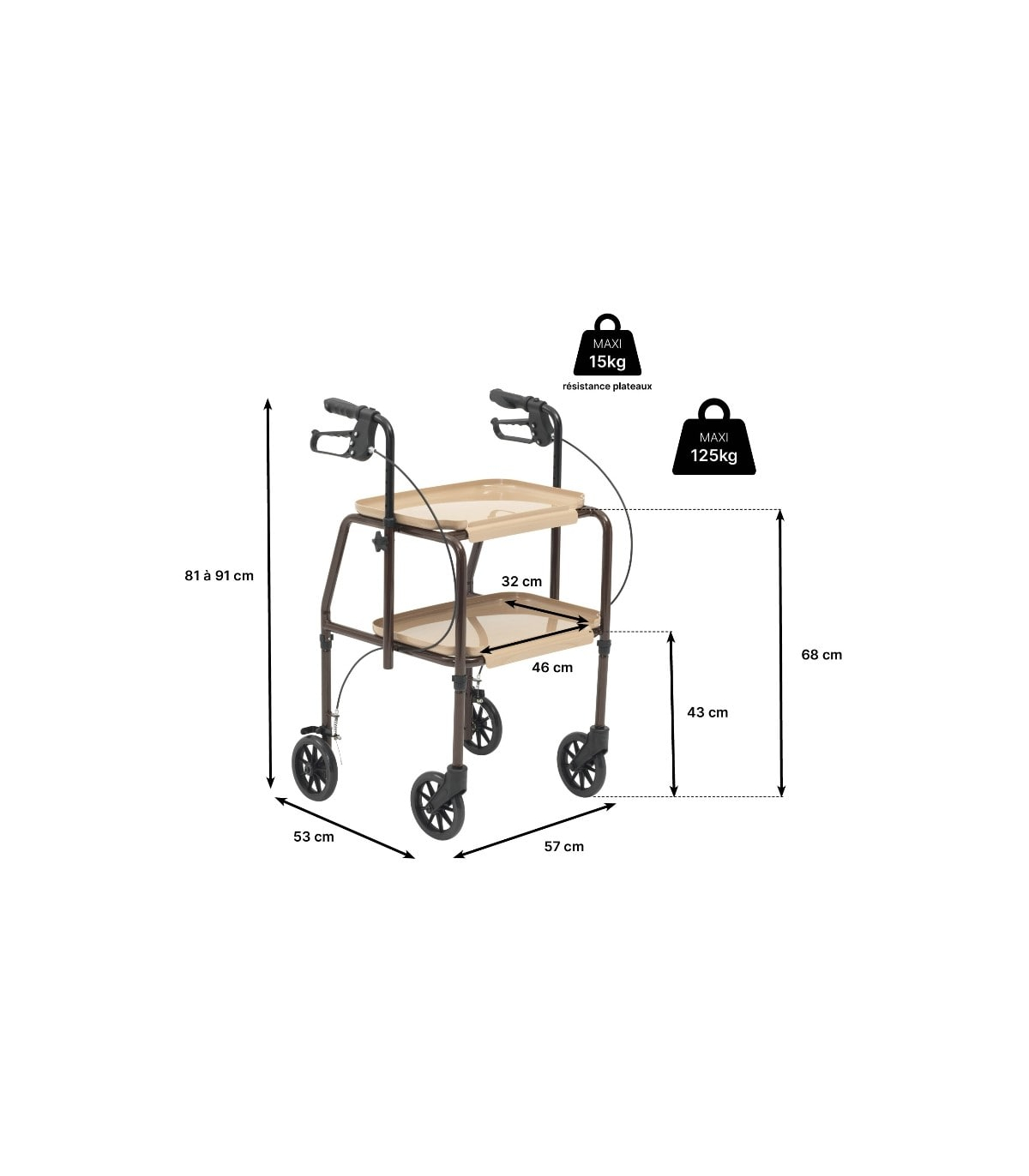 La table desserte roulante médicale comporte 2 plateaux clipsés pour vous permettre d'emporter vos repas de la cuisine vers la salle à manger. La résistance maximum des plateaux est de 15 kg.
