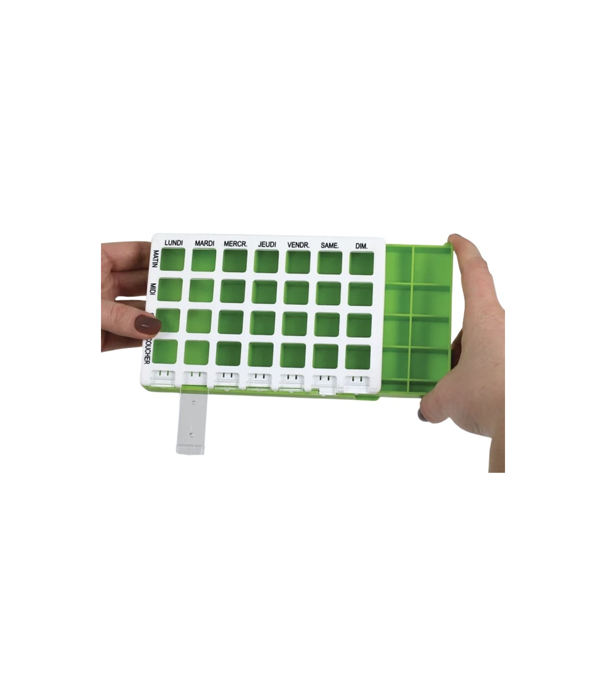 Grâce à leurs façades transparentes, les tiroirs du pilulier hebdomadaire permettent de voir immédiatement le contenu de chaque case. Cela offre un contrôle rapide pour s’assurer que les médicaments sont bien en place ou ont déjà été pris, sans avoir à ouvrir chaque compartiment.