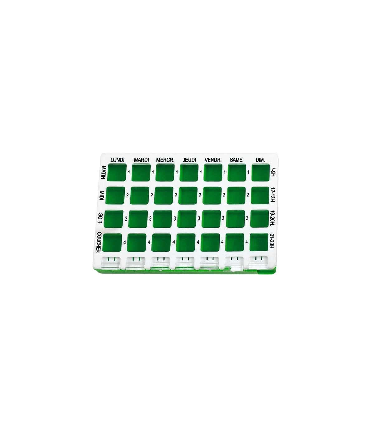 Le pilulier semainier Dolcimo Classic proposé à un prix attractif contient 28 cases, soit 4 compartiments par jour sur 7 jours, pour organiser les prises de médicaments du matin, midi, soir et nuit.