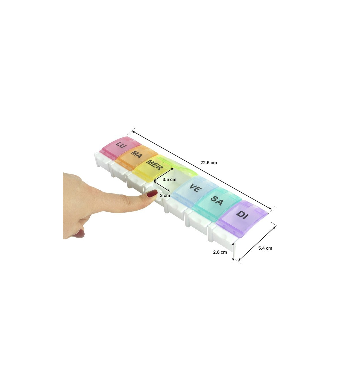 Le pilulier semainier est coloré et identifié par jour, ce qui permet une reconnaissance visuelle rapide et facile de chaque compartiment grâce au code couleur.