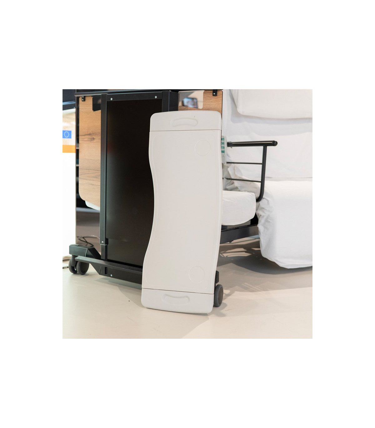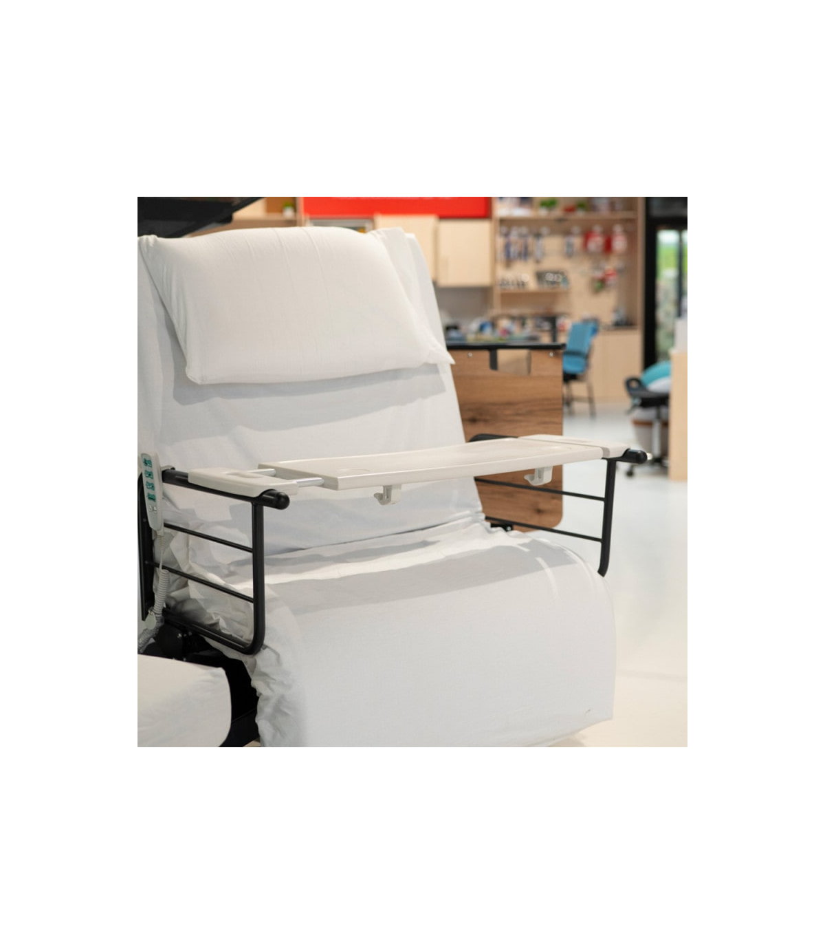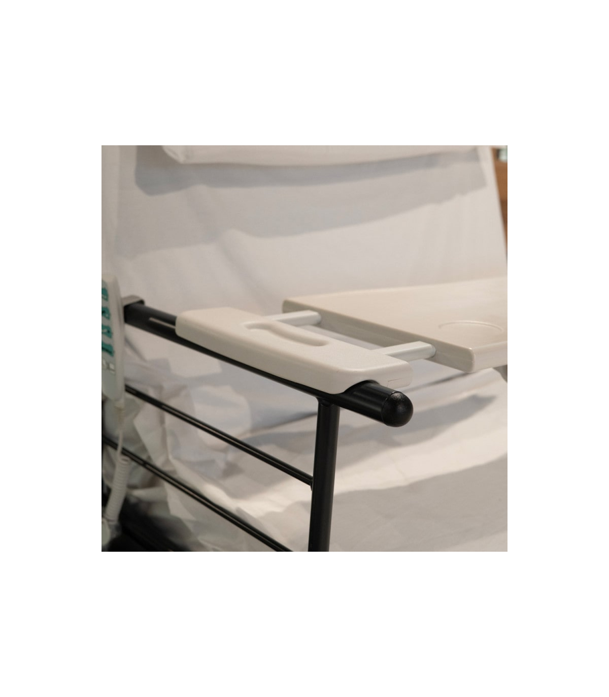 Cette tablette est uniquement compatible avec les lits médicalisés électriques 1 personne disposant de barrières de chaque côté du lit comme par exemple, le lit médicalisé électrique 1 place rotatif Orbit ou encore le lit électrique médicalisé 1 personne Euro 1000.
