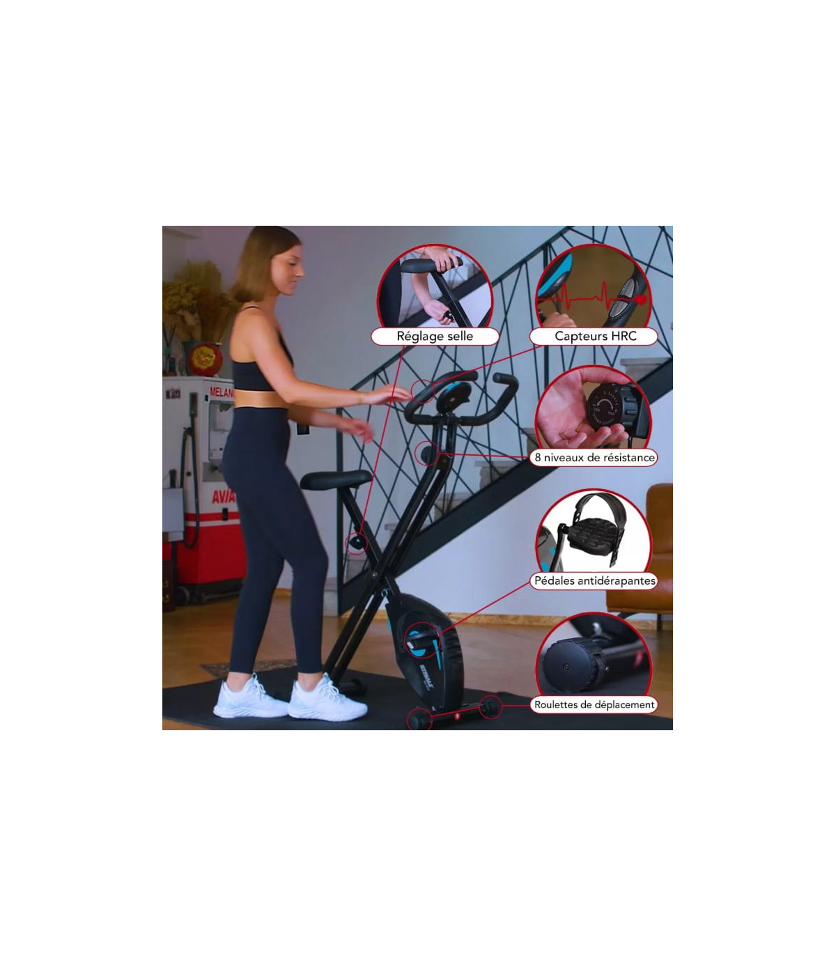Le vélo pliable Striale est livré rapidement et partiellement monté pour un déballage facile. Son système pliable et les roulettes de déplacement facilitent le transport et le rangement dans votre appartement, permettant des séances de cardio et musculation accessibles à tout moment.